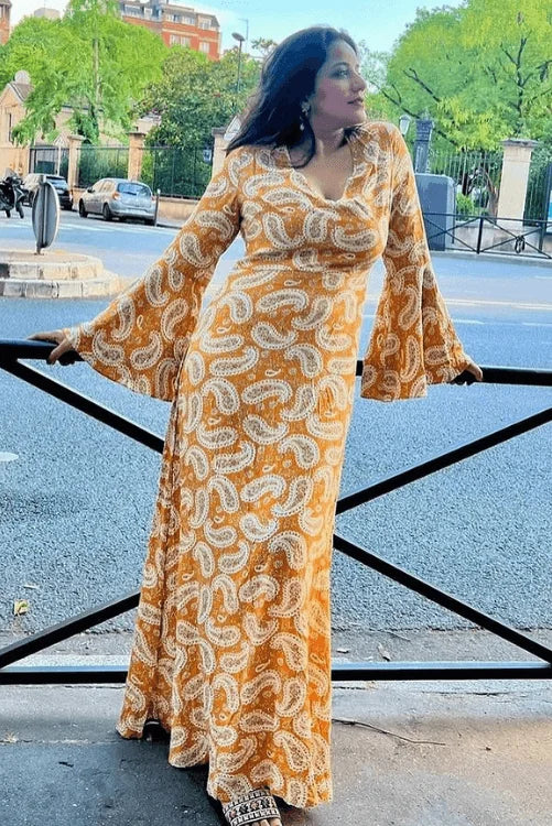 Bohemian Bell Sleeves Paisley Print Maxi Dress