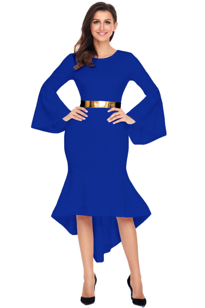 Bell Sleeve Dip Hem Belted Dress